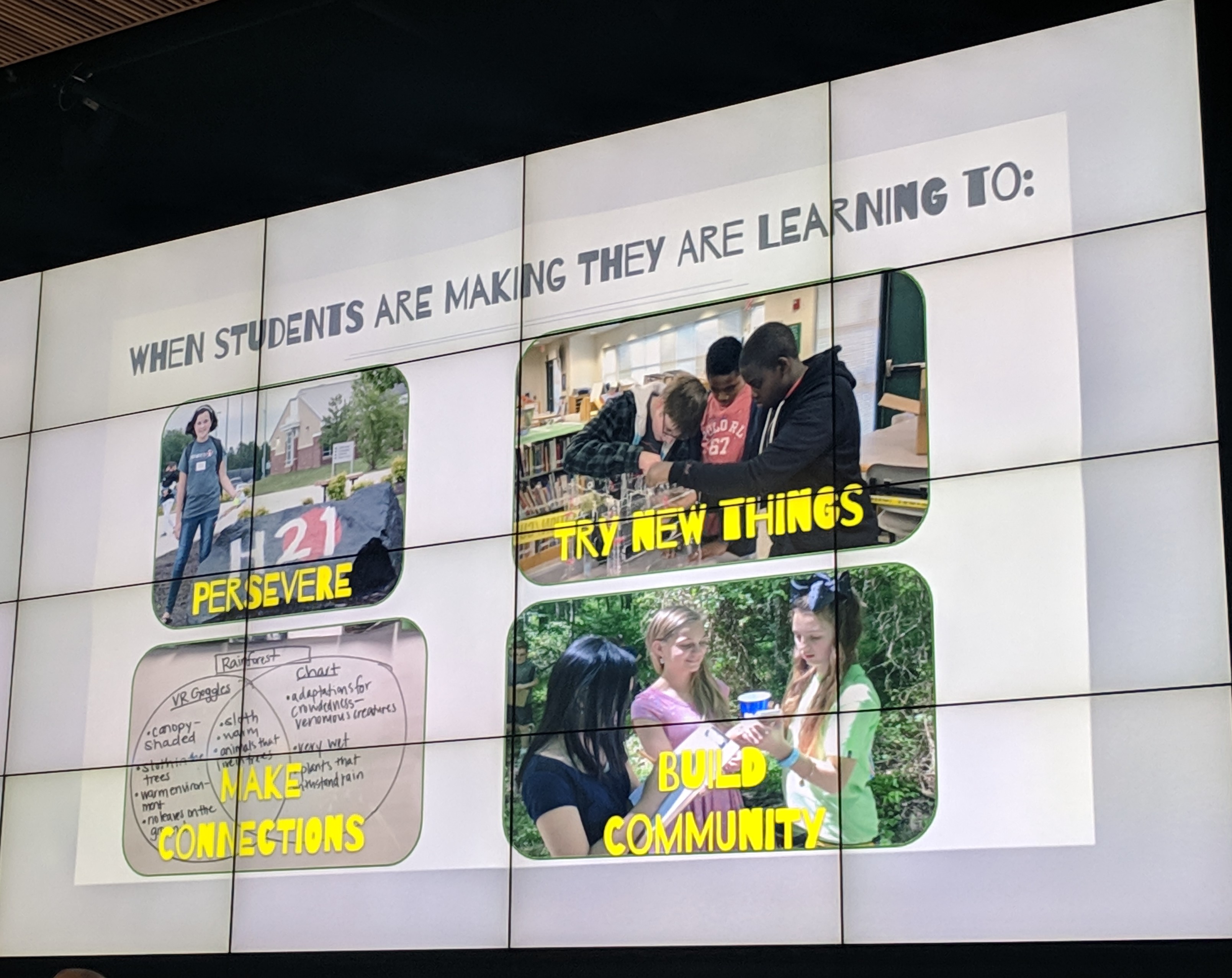In a later session entitled “Making Innovators” with their school’s Innovation Learning Coach, Mike Dunavant, I would learn that the inside of this chart describes “the what” with characteristics of the 5C’s; Communication, Collaboration, Critical Thinking, Creativity, and Citizenship. They’ve added a 6th C with Character. The outside of the chart is “the how” with the 4 Pillars from the Deeper Learning Model. They’ve pushed the focus to be on what students are doing.