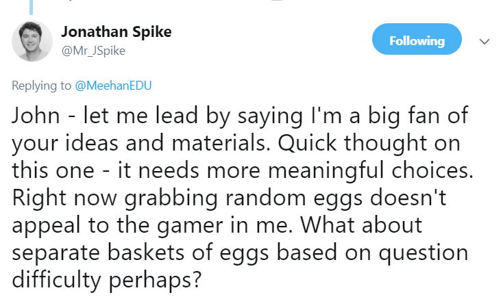 Then there’s this last idea from Jonathan Spike: use separate baskets of eggs based on question difficulty. What smart ideas!