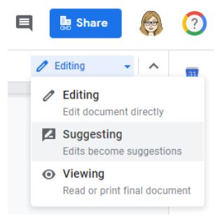 Suggestion Mode – Another one of my favorite editing tools! This tool changes the document from edit mode, which is the default mode Google Docs is set in and changes it to suggestion mode. It allows another person the document is shared with to add suggestions but not actually change the document. Changes are seen in green and the original user can approve or reject suggestions. Click on “Editing” under the share button and select “Suggesting” to move into this mode.