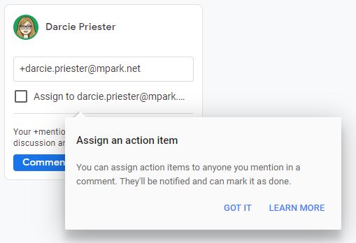 The cool thing about this comment feature is that you can tag students, so they see a specific comment. In the comment box type +studentname and it will automatically come up with the student’s name. If Gmail is turned on at your school for students, it will also email them that they have been tagged in a comment.