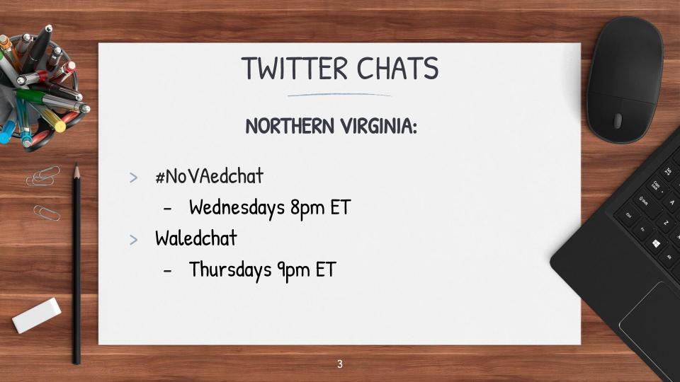 If Twitter Chats are something that are completely new to you, I highly recommend just checking them out at first. You don’t have to participate, just watch and see the progression and understand the rhythm. Some good Twitter Chats to follow in the Northern Virginia area are #NoVAedchat and #Waledchat, and other general chats are #satchat that takes place on Saturday mornings, #pblchat for those wanting to discuss project-based learning, #sschat for social studies teachers, and #TLAP for fans of David Burgess’ approach of teaching like a pirate.