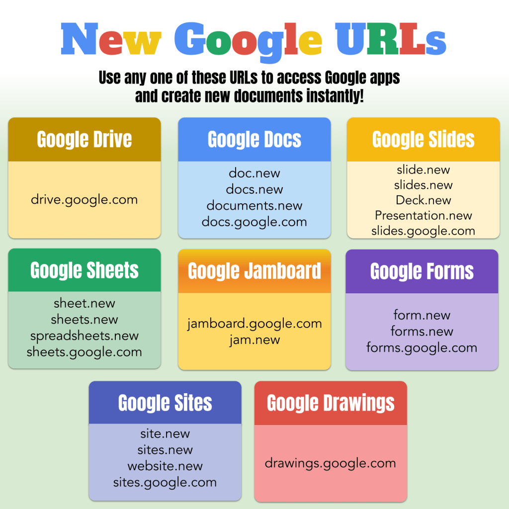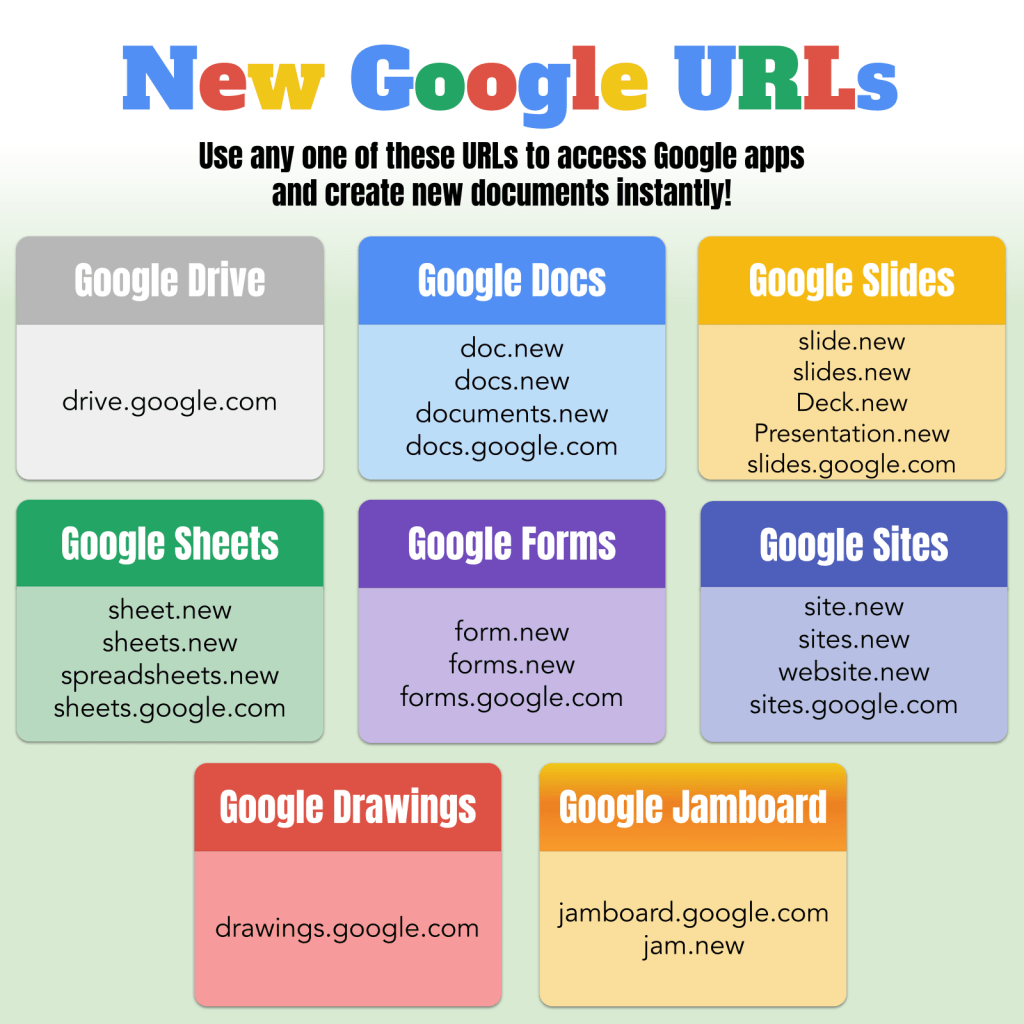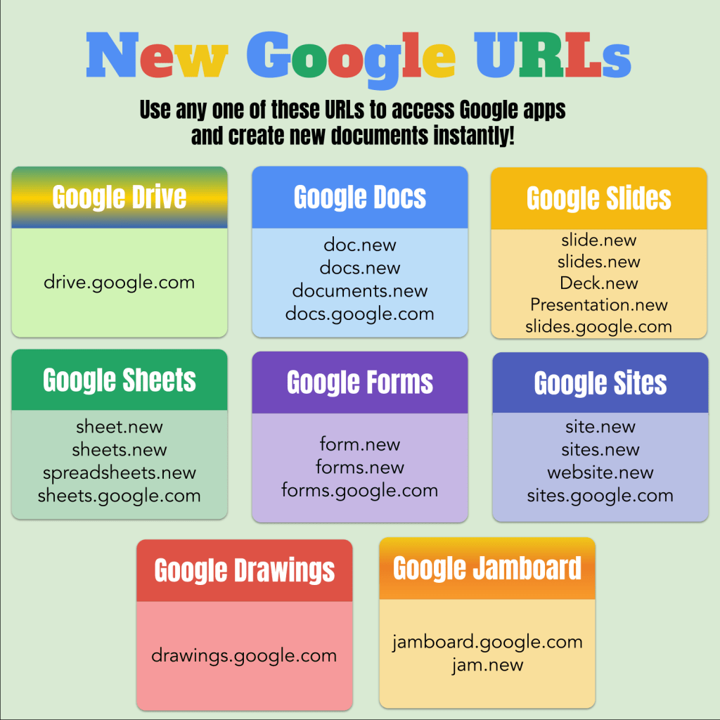 The title matches the colors in the Google logo, while the headers match the colors of the specific Google products. The boxes with the URLs have a lighter matching color.