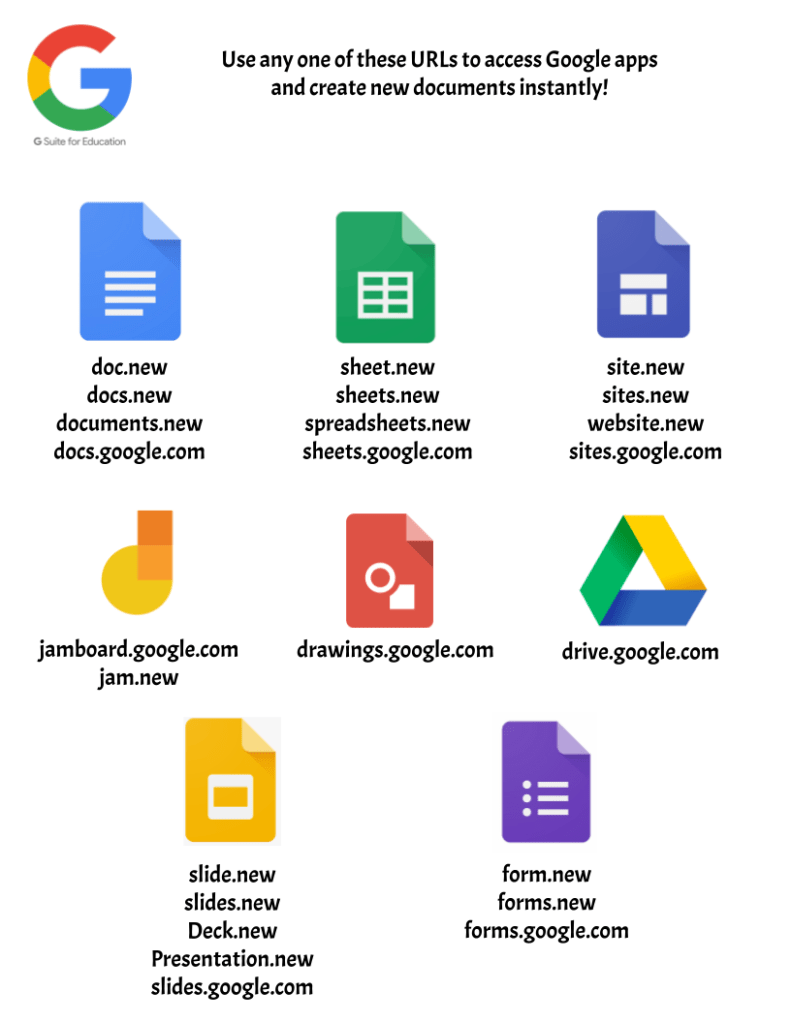 Then this past August, I developed a professional development session as a sort of refresher on the core G Suite Apps (now Google Workspace) to re-learn new or forgotten features. I dug this graphic out to include in the session, but it needed to be updated with the addition of Jamboard and some new URLs.