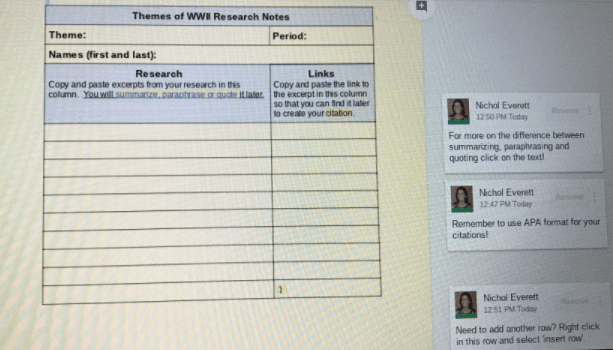 Moving to the next assignment, you can see I kept the link to the first activity in case students need to refer to it again, and made the second activity stand out. This activity is linked to a Google Doc with a table for students to collaborate on and complete together. Each student in the group can add to each area or they could split up each question to complete among themselves.