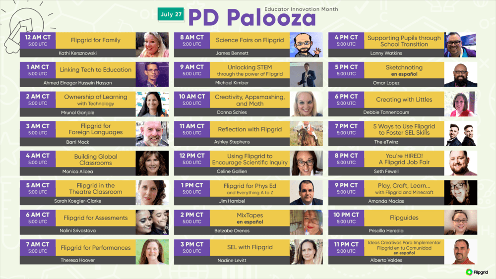 And last, but not least, Flipgrid announced their Educator Innovation Week, July 12 – 16, with special events. After going to the website to find out more, I realized it’s really the whole month as they have special PLCs going on the entire month, plus virtual sessions during the 12-16 at 11AM CT, and a special 24 hour Global PD event on July 27th. Each session lasts for 15 minutes every hour on the hour starting at 12:01am CT. Here’s the schedule below: